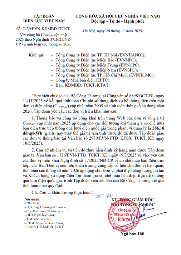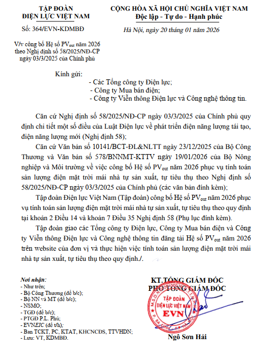 Tập đoàn Điện lực Việt Nam (Tập đoàn) công bố Hệ số PVout năm 2026 phục vụ...