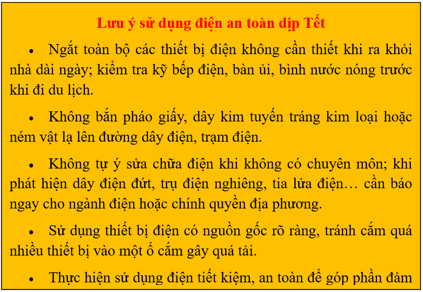 Theo kế hoạch, thời gian từ 0 giờ ngày 14/02/2026 (27 Tết) đến hết 24 giờ ngày 22/02/2026 (mùng 6 Tết) đảm bảo cung cấp điện xuyên suốt, an toàn, chất lượng cho các phụ tải; ưu tiên điện cho các cơ quan Đảng, chính quyền, bệnh viện, cơ sở cấp nước, các địa điểm tổ chức sự kiện văn hóa – nghệ thuật, vui chơi giải trí trong dịp Tết; hạn chế tối đa sự cố gây mất điện diện rộng, kéo dài.