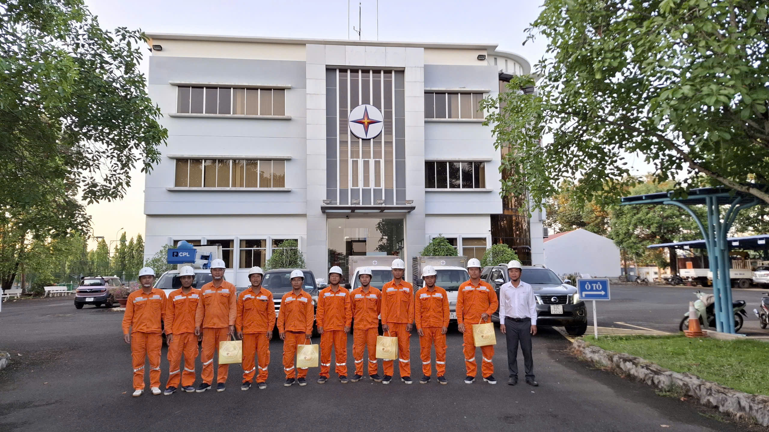 Đại diện Công đoàn Điện lực Hớn Quản thăm hỏi, trao quà động viên các nhân viên đang ứng trực, đảm bảo cung cấp điện tại các điểm bầu cử trên địa bàn.