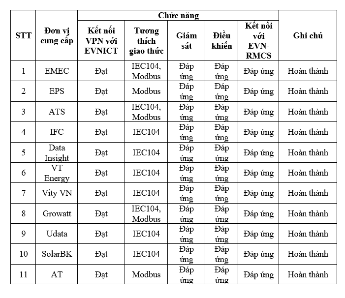 Ngày 25/3, Công ty Viễn thông Điện lực và Công nghệ thông tin (EVNICT) đã báo cáo Tập đoàn Điện lực Việt Nam kết quả thử nghiệm kết nối thiết bị GSĐK ĐMTMN với phần mềm EVN-RMCS. Theo đó có 11/ 14 đơn vị đáp ứng và đạt các chức năng kết nối thiết bị GSĐK ĐMTMN với phần mềm EVN-RMCS.