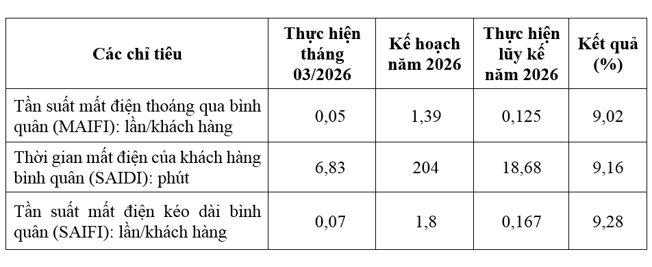 - Doanh thu tiền điện tháng 03/2026 đạt 3.939,3 tỷ đồng, lũy kế đạt 10.549,04 tỷ đồng.